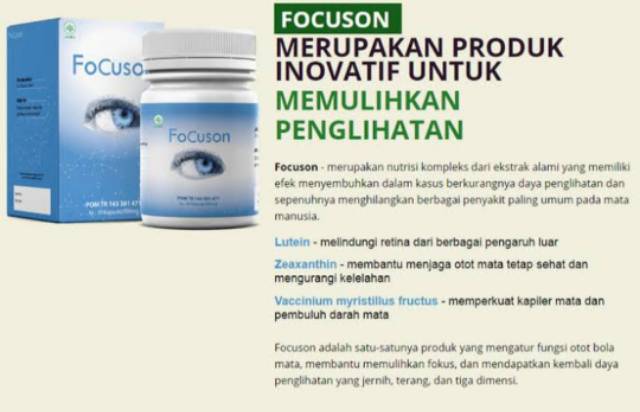Focuson Formula Kesehatan Mata mengandung bahan-bahan yang dipelajari secara klinis, nutrisi kunci tambahan dan program gaya hidup untuk mendukung kesehatan mata. * Formula ini juga menawarkan campuran khusus antioksidan dan nutrisi lain untuk melindungi mata dari kerusakan sel dan mendukung pelebaran dan sirkulasi pembuluh darah yang sehat.